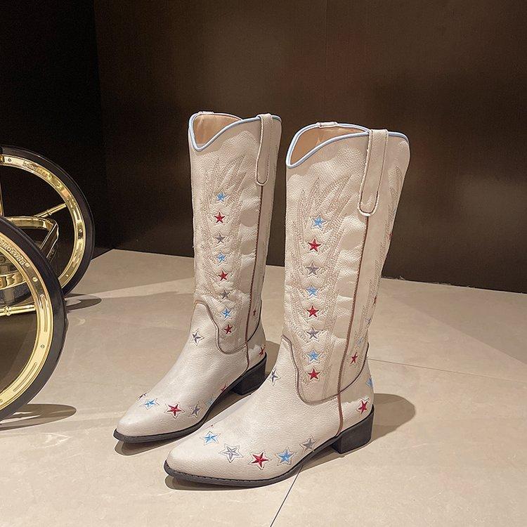 Винтажные вышитые остроконечные ковбойские сапоги в стиле вестерн женские летние 2024 года новые толстые каблуки универсальные рыцарские сапоги высокие сапоги с рукавами 42