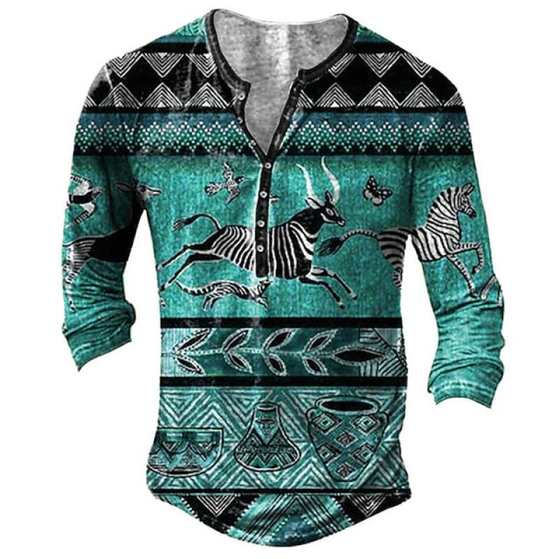 Винтажные мужские футболки с пуговицами с этническим узором и принтом, весенне-осенние свободные футболки с круглым вырезом и длинными рукавами, мужская одежда