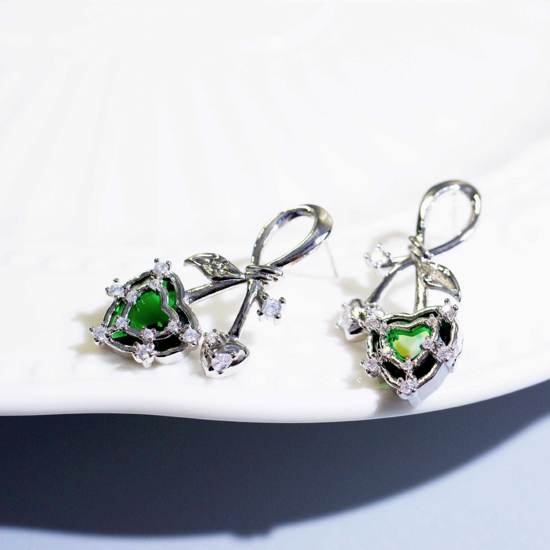Винтажные серьги с зеленой вишней и цирконами, геометрическим сердечком и листьями. Очаровательность серебряный