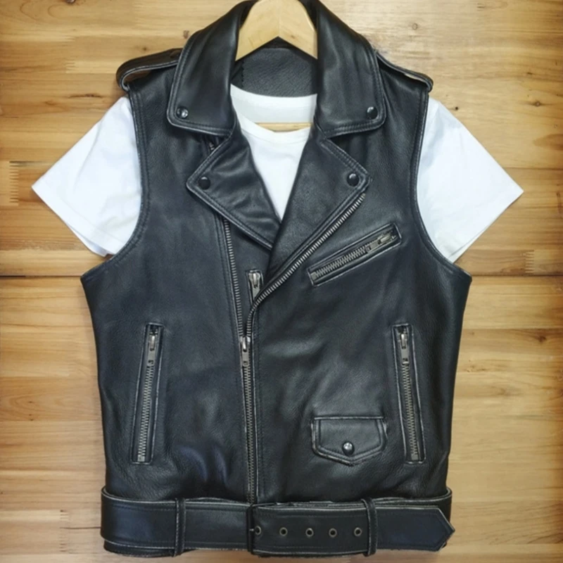 Винтажный Черный весенний кожаный жилет, мужской мотоциклетный приталенный короткий жакет из натуральной воловьей кожи