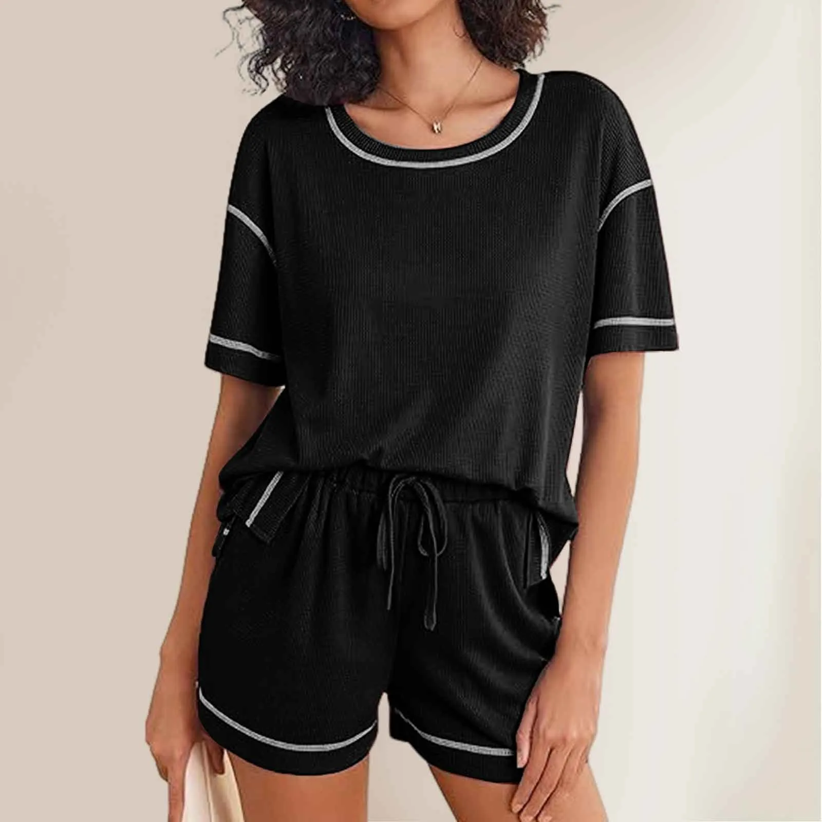 Винтажный комплект из двух предметов, женский модный топ с круглым вырезом и коротким рукавом, шорты на шнуровке, пижама, однотонный повседневный костюм для женщин