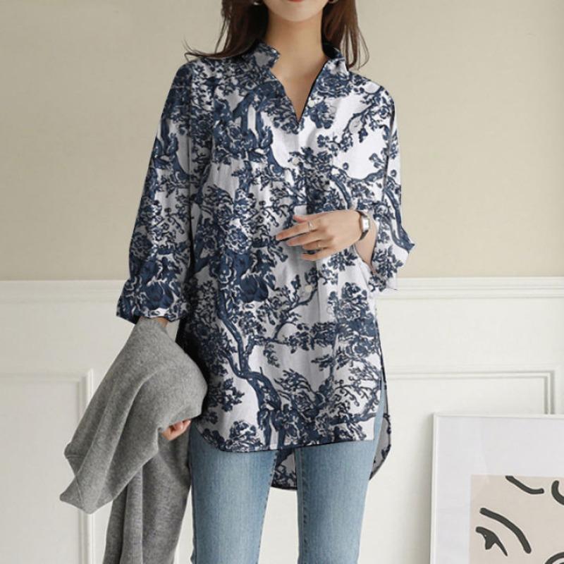 Винтажный принт Повседневная нестандартная рубашка с длинным рукавом Весна Осень Большие размеры Свободные Простые блузки Офисные женские воротник-стойка Модные элегантные топы 2879 5XL белый