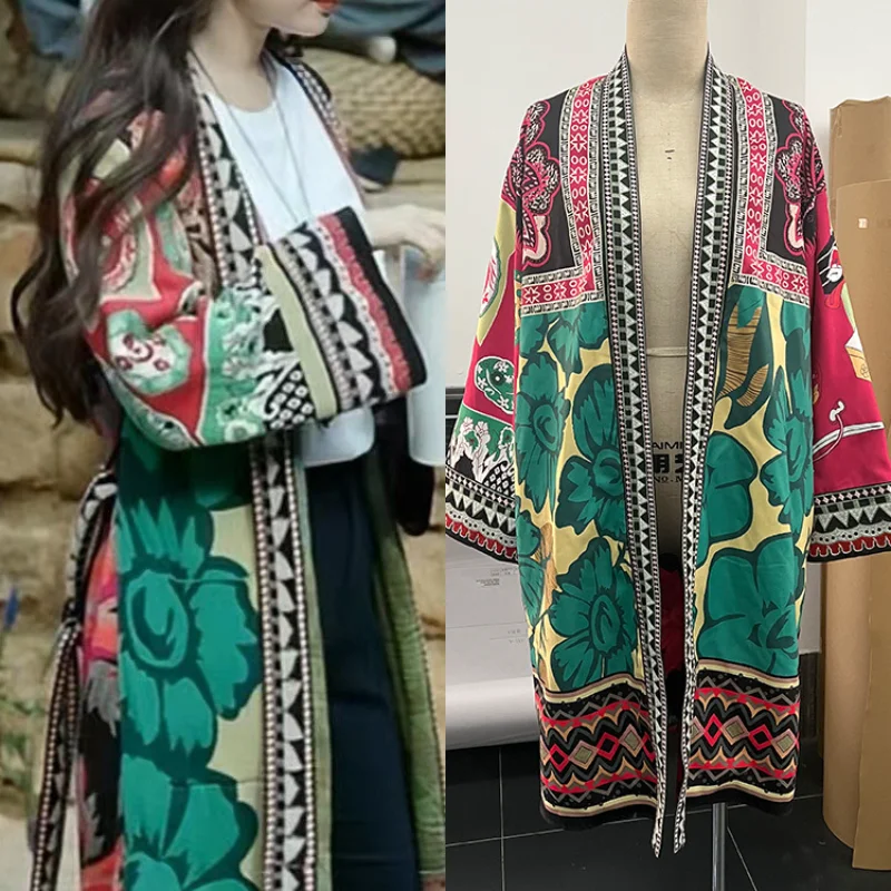 Винтажный тренчкот в этническом стиле с цветным блочным принтом, как у Лю Ифэй, пальто средней длины для женщин