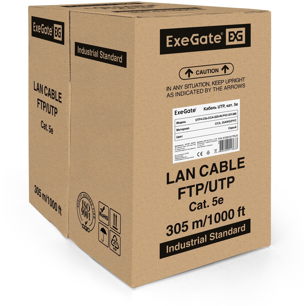 Витая пара UTP кат.5e, 4 пары, CCA, 0.46 мм, 305м., внутренний, одножильный, PVC, серый, Exegate UTP4-C5e-CCA-S25-IN-PVC-GY-305 (EX281817RUS), UTP4-C5e-CCA-S25-IN-PVC-GY-305