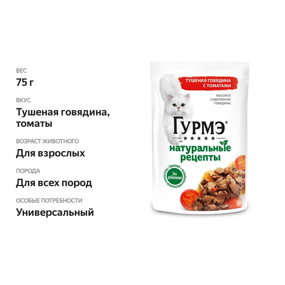 Влажный корм Гурмэ Натуральные рецепты для кошек тушеная говядина с томатами 75 г