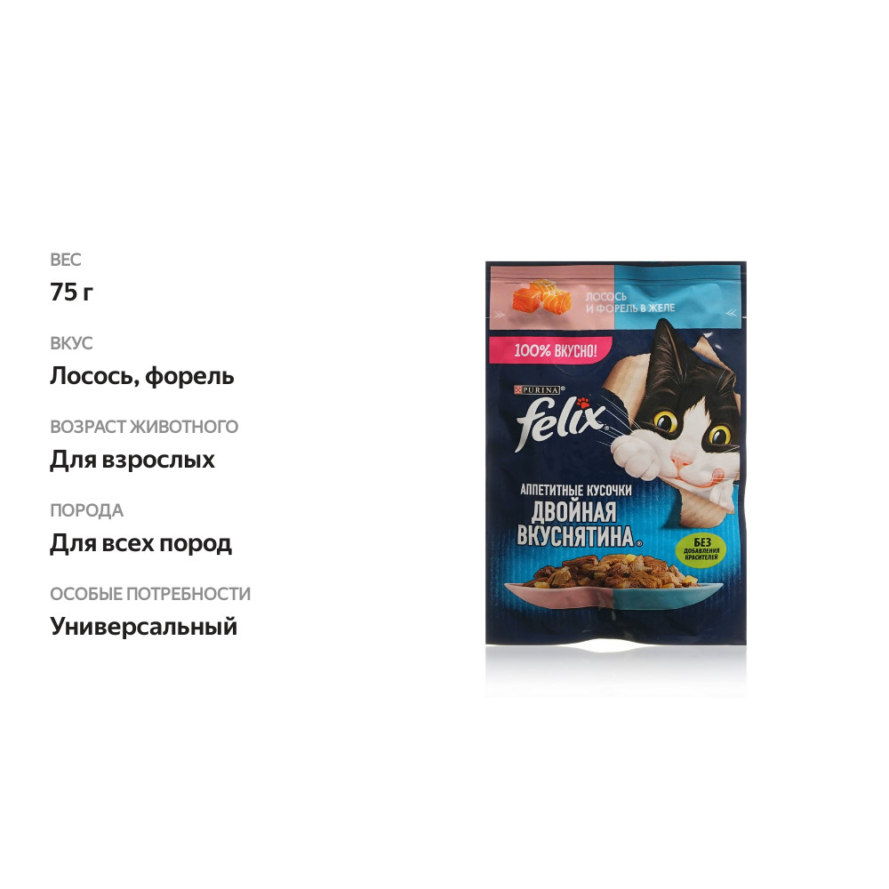 Влажный корм для взрослых кошек Felix Аппетитные кусочки Двойная Вкуснятина с лососем и форелью в желе 75 г