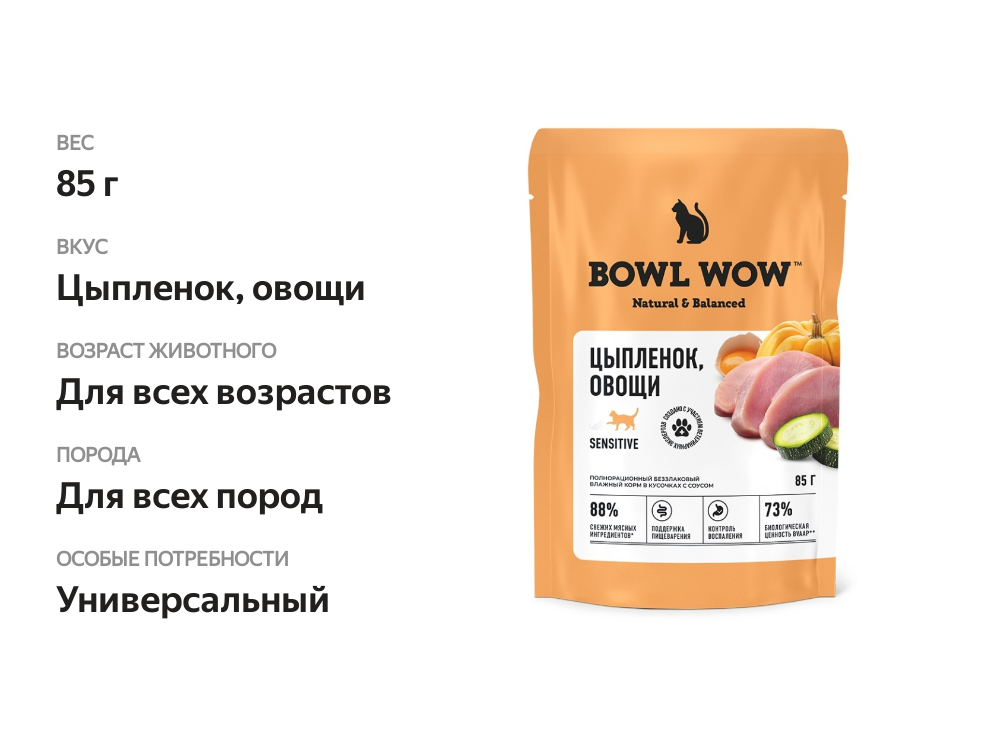Влажный корм Bowl Wow для кошек с чувствительным пищеварением Цыпленок овощи 85 г