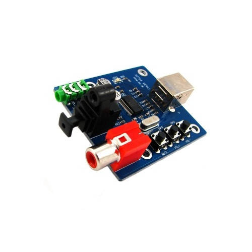 Данное устройство представляет собой внешний стерео цифро-аналоговый преобразователь построенный на чипе РСМ2704.ЦАП предназначен для высококачественного воспроизведения музыки с компьютера, построения Hi-Fi аудиосистемы или продвинутого робопроекта.Являясь внешним устройством, ЦАП лучше защищен от помех и наводок по питанию ПК, уменьшая шумы.Приятной особенностью является встроенный усилитель мощности для наушников, обеспечивающий на нагрузке сопротивлением 32 Ом мощность 12 мВт при коэффициенте гармоник в 0.025 % Выходы: аналоговый (3.5 мм джек), коаксиальный S/PDIF (RCA), оптический Рабочее напряжение: 5 В, питается от USB-шнурка (в комплект не входит) Отношение сигнал/шум: 98 дБ Частота дискретизации (16 бит): 32, 44.1 и 48 кГц Наличие кнопок на плате для регулировки громкости Plug&Play устройство