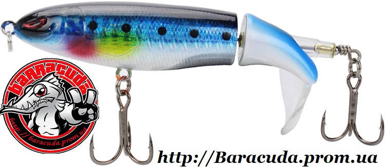 Воблер воппер 10 см, цвет - бело-голубые бока в черную точечку, спинка черная, живот белый. Вращающийся хвост на 360 градусов, чтобы привлекать рыбу с дальних дистанций, на которых приманка не может быть обнаружена при помощи зрения.