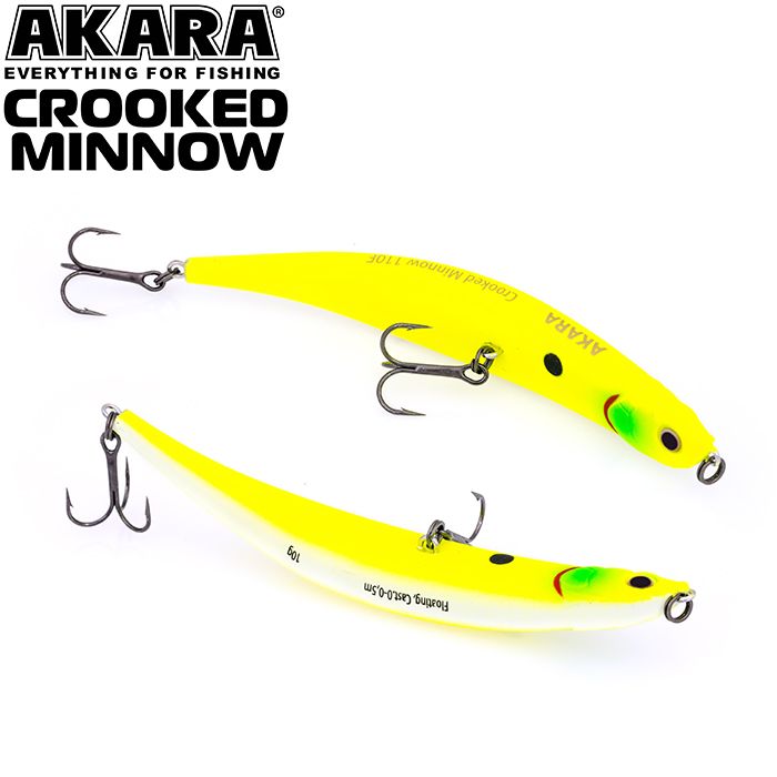 Akara Crooked Minnow 110F плавающий безлопастной воблер оригинальной формы длиной 110 мм. Отлично подходит для ловли по небольшим глубинам. Неповторимая игра на рывковой проводке позволяет облавливать даже маленькие окошки среди водной растительности. Допускает равномерную проводку. Основным объектом ловли для этой приманки выступает щука, а также окунь. Заглубление до 0,5 м. Оснащен крючками из высокоуглеродистой стали.