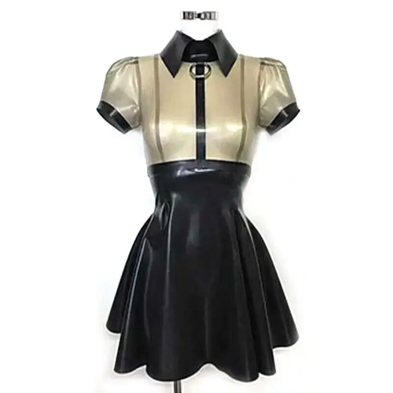 Sexy Transparent Black and Black Latex Rubber Skate Dress Short Sleeve with Back Zip