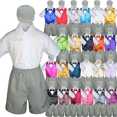 Baby Boys Toddler Formal Vest Shorts Suit Satin Vest Bow Tie 5pc Silver Set S-4T
