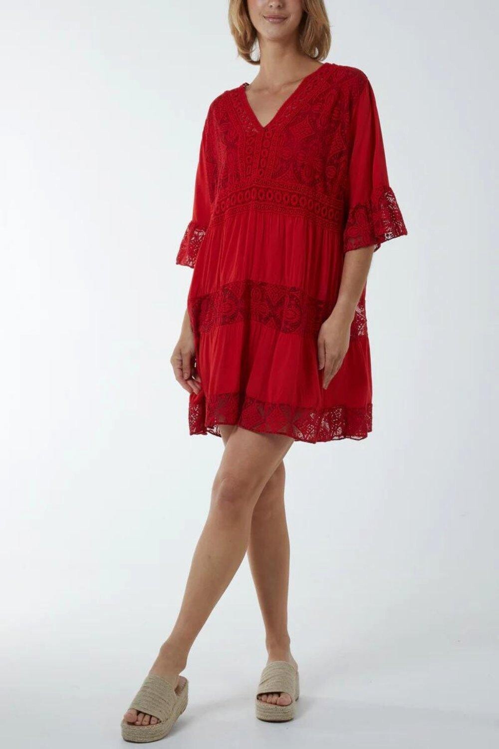 Кружевное мини-платье с рукавами 3/4 и V-образным вырезом оверсайз HOXTON GAL, красный