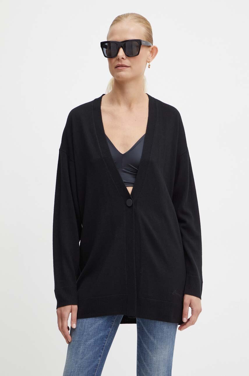 Жилетка Armani Exchange. Моделът е направен от фин трикотаж. Вълната, благодарение на високите си терморегулиращи свойства, запазва топлината, когато е студено, и охлажда, когато е топло.- Свободна кройка за пълна свобода на движение.- Паднало рамо за свобода на движението.- Еластични краища.- Закопчаване с копче.- Тънка и еластична материя.- Дължина на ръкава (измерена от деколтето): 68 cm.- Дължина: 73 cm.- Ширина под мишниците: 53 cm.- Мерките се отнасят за размер: S.