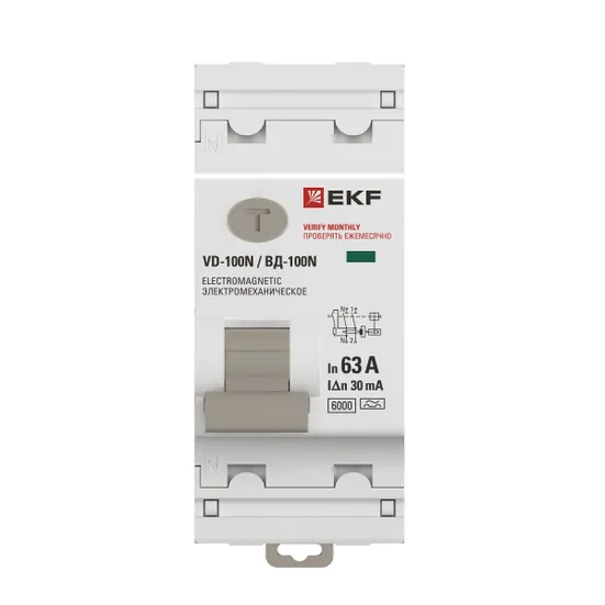 Выключатель дифференциальный (УЗО) PROxima ВД-100N, 2P, 63А, 30мА, электромеханический, тип A, EKF (E1026MA6330), ВД-100N