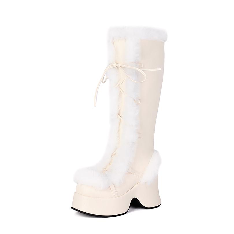 Высокая платформа Меховая вставка Микрофибра Перекрестная шнуровка Толстая плюшевая подкладка Тепло Зимние ботинки Задняя молния Увеличивающие рост Ботинки до колена 38 бежевый