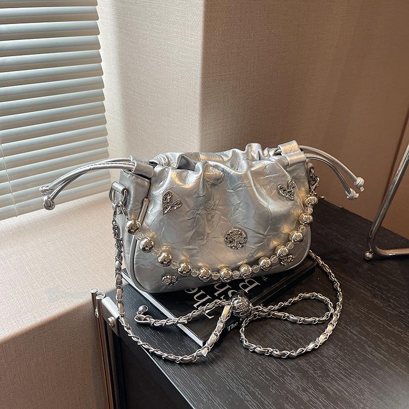 Высококачественная нишевая сумка женская летняя 2024 новая модная сумка-мессенджер с цепочкой женская популярная плиссированная сумка-ведро серебряный