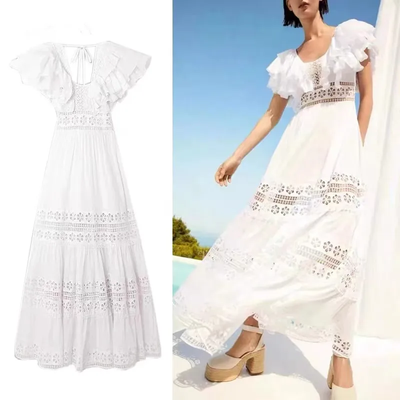 Высококачественные летние женские кружевные ажурные гофрированные модные элегантные хлопковые сексуальные платья с вышивкой на спине для праздника