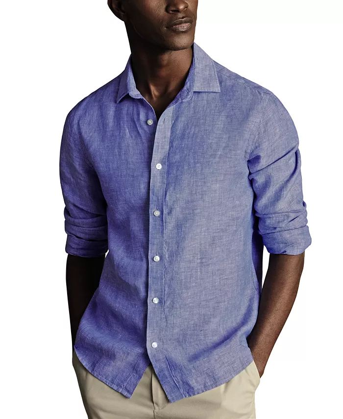 Мужская льняная рубашка на пуговицах с длинным рукавом Slim Fit Charles Tyrwhitt, синий