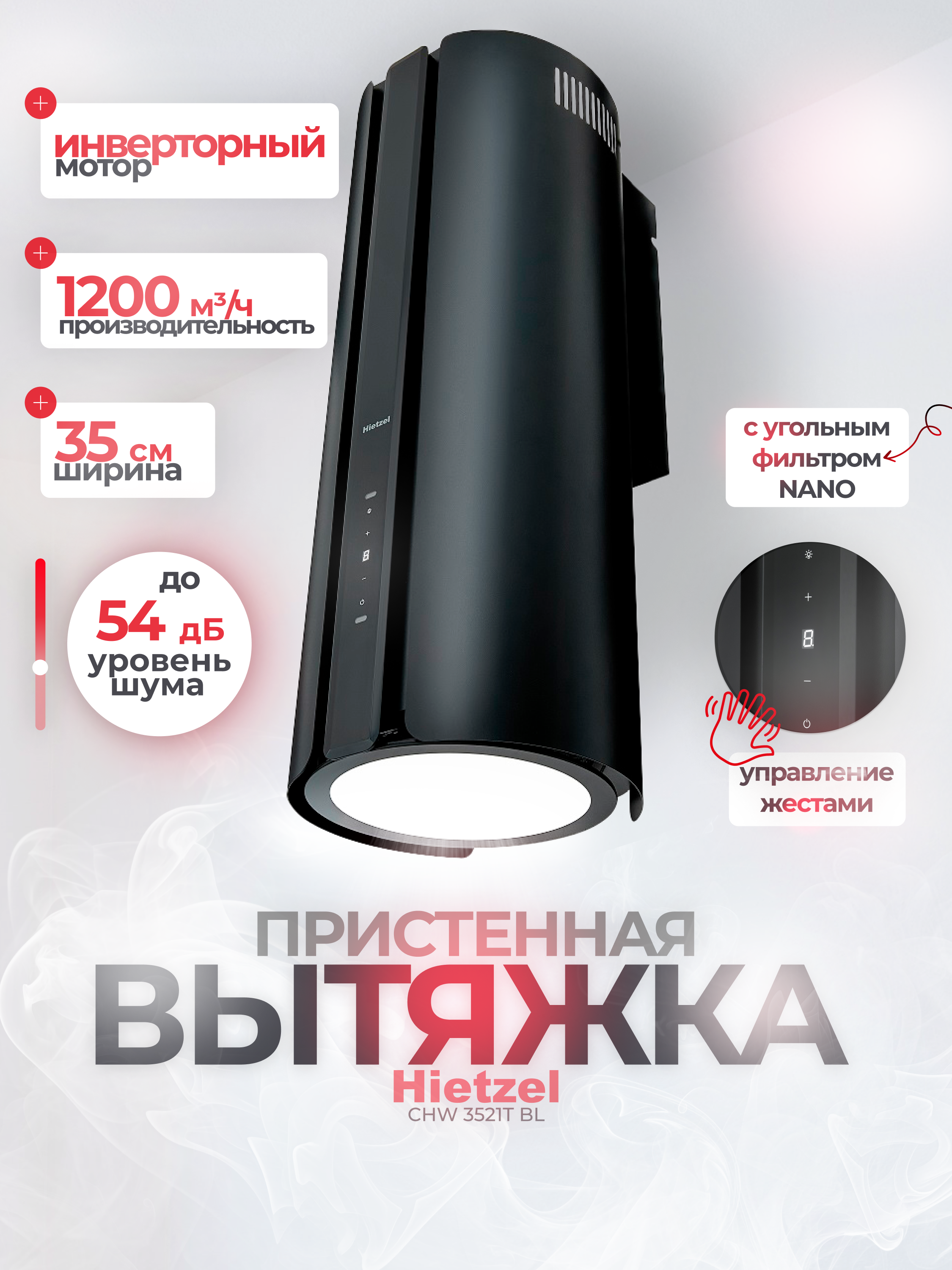 Кухонная вытяжка Hietzel CHW 3521T BL это современное и эффектное решение для вашего интерьера. Выполненная в черном цвете, эта вытяжка станет великолепным дополнением вашей кухни, придавая ей стильный и элегантный вид. Ширина устройства составляет 35 см, что делает его идеальным для установки в небольших помещениях и уютных кухонных уголках.Эта вытяжка цилиндрическая имеет интуитивное сенсорное управление с жестами, что облегчает работу с ней. Просто проведите рукой, чтобы установить нужный режим. С девятью доступными скоростями вы сможете легко настроить производительность под свои нужды, обеспечивая оптимальное удаление загрязнений и неприятных запахов. При общей мощности 106,5 Вт и мощности двигателя 100 Вт, данная вытяжка демонстрирует отличные эксплуатационные характеристики.С производительностью 1200 м?/ч, вытяжка цилиндрическая для кухни Hietzel CHW 3521T BL с инверторным мотором эффективно справляется с задачами удаления избыточного пара и неприятных запахов. Уровень шума составляет всего 54 дБ, что делает ее одной из самых тихих моделей на рынке вы сможете готовить и общаться на кухне без лишних хлопот и звуков.Диаметр воздуховода составляет 150 мм, что позволяет легко интегрировать данное устройство в существующие вентиляционные системы. Вы также оцените практичное LED освещение (16,5 Вт), которое ярко освещает рабочую поверхность, создавая комфортные условия для готовки.Вытяжка кухонная цилиндрическая Hietzel CHW 3521T BL это не только отличная производительность, но и стильный дизайн, который преобразит ваше пространство. Ее преимущества заключаются в высоком уровне функциональности, удобстве эксплуатации и современном внешнем виде. Создайте комфортную атмосферу на кухне и избавьтесь от неприятных запахов, выбрав именно эту вытяжку цилиндрическая пристенная.Не упустите возможность улучшить качество воздуха в вашем доме с помощью надежной и производительной вытяжки от Hietzel. Кухонная вытяжка Hietzel CHW 3521T BL станет вашим незаменимым помощником на кухне, гарантируя чистоту и свежесть воздуха во время приготовления любимых блюд. Выберите ее для своего дома и наслаждайтесь высокими стандартами качества!