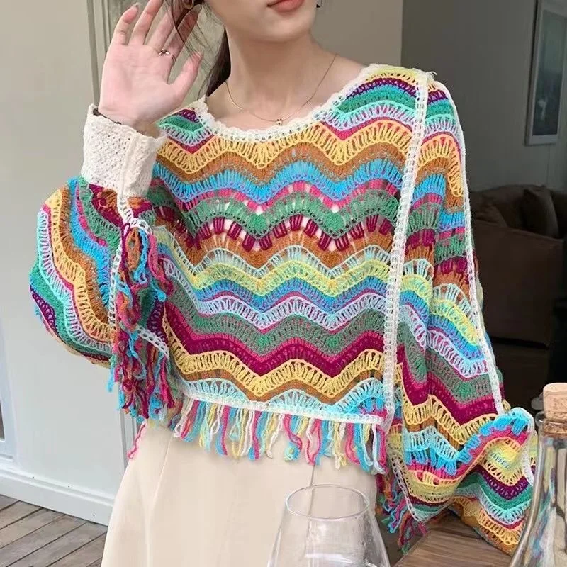 Вязаная накидка с радужными крючками и цветами, свободный многослойный Топ