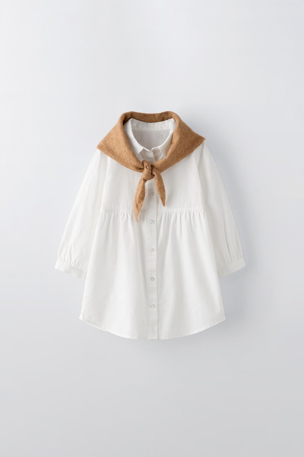 Платье с рубашечным воротником и длинными рукавами. Застежка на пуговицы спереди. Съемная трикотажная бандана на плечах.