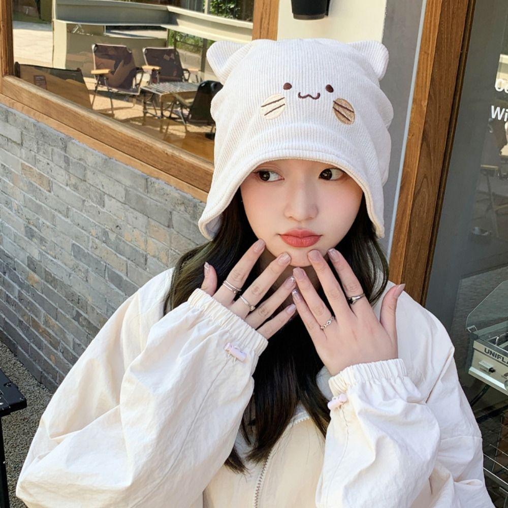 Вязаная шапка-пуловер, защита ушей, кошачьи ушки, симпатичная уличная одежда бежевый
