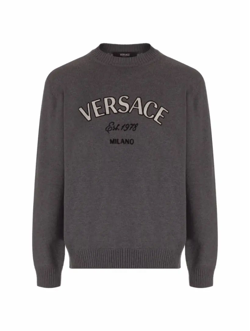 Вязаный джемпер прямого кроя из мягкой шерсти. Круглый вырез, вышитый логотип бренда Versace Milano Stamp спереди, воротник, манжеты и основание в рубчик. Характеристики товара для размера 50: обхват груди - 124 см, обхват талии - 124 см, длина рукава от плечевого шва - 68 см, длина изделия по спинке - 72 см.