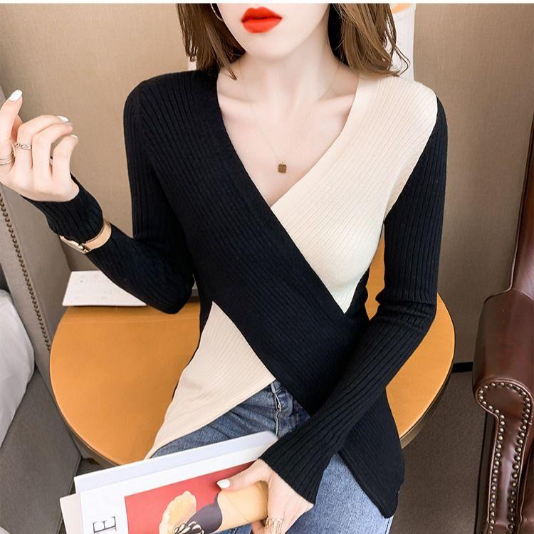 Вязаный свободный свитер нестандартной формы с v-образным вырезом, женская одежда, осенне-зимние универсальные повседневные пуловеры, вязаные топы L (50-55kg) чёрный