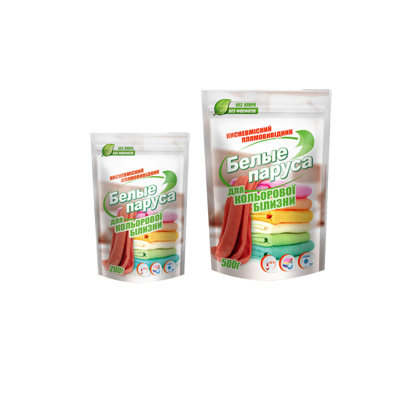 Призначений для видалення плям з усіх видів тканин, окрім вовни та шовку. Забезпечує надзвичайно делікатне прання, що задовольняє найвибагливіших споживачів. Засіб проникає між волокнами тканин та усуває найскладніші плями від ягід, чаю, кави, вина тощо. Окрім того, він запобігає небажаному переносу барвника на різнокольорових тканинах. Освіжає кольори і усуває неприємні запахи. Нещадний до бактерій. Кисневмісний плямовивідник «Белые паруса» для кольорових тканин не містить хлору тому зберігає якість тканини.Завдяки щадній формулі його можна використовувати не лише для автоматичного, але й для ручного прання — він не завдає шкоди шкірі рук і не викликає алергічних реакцій. Плямовивідник «Белые паруса» ефективний при низьких температурах і може використовуватися для посилення дії прального порошку. Упаковка вагою 500г має зіп-застібку, яка забезпечує зручне зберігання засобу після його відкриття. Торговая марка:ТМ «Белые Паруса» Фасовка:200 г. 500 г.