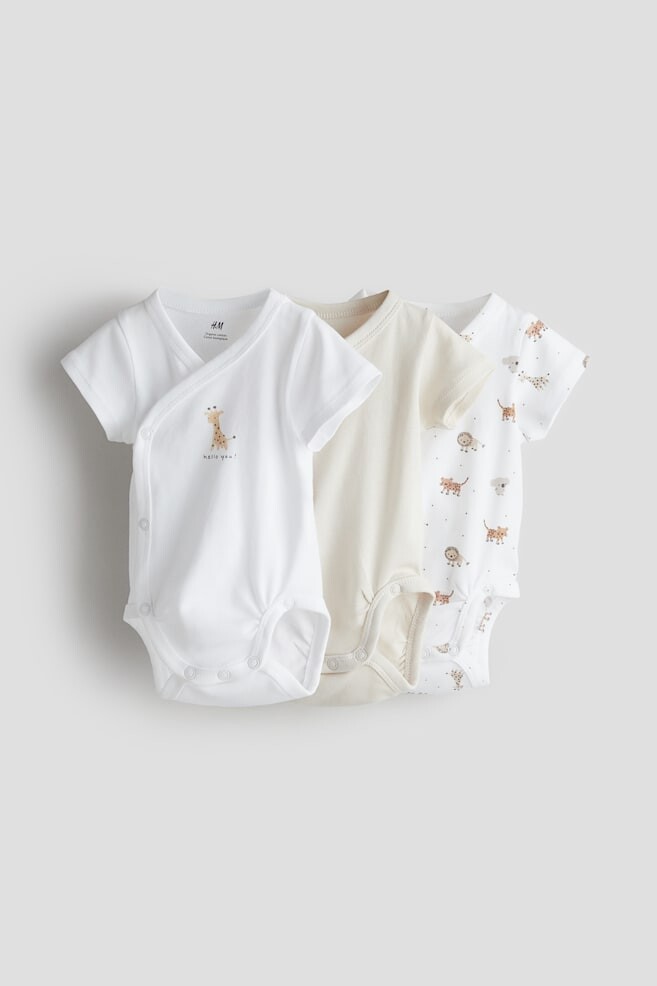 Боди с запахом из мягкого хлопкового трикотажа, с короткими рукавами и кнопками с одной стороны и в промежности. Штуков/пар: 3 Длина рукава: короткий рукав Фильм: запах на запах Вырез: V -шея