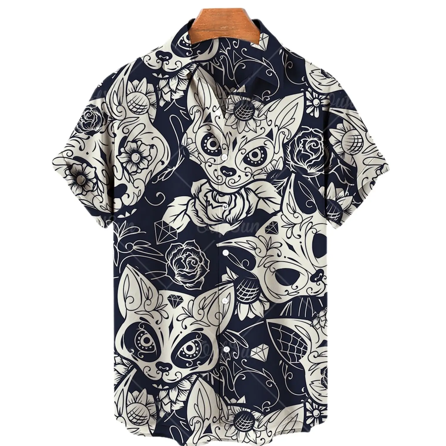 Гавайская Мода 2022, мужская рубашка, повседневные топы с принтом милого кота, Пляжная рубашка с коротким рукавом, летняя рубашка с лацканами ...
