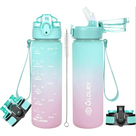 Kids Water Bottle 2 Pack with Straw 17oz Water Bottles Motivational Time Marker with 2 Lids(Straw/Chug) Leakproof Tritan BPA Free 10pcs Stickers Reusable Bottles for Boys/Girls(Pink-Blue)