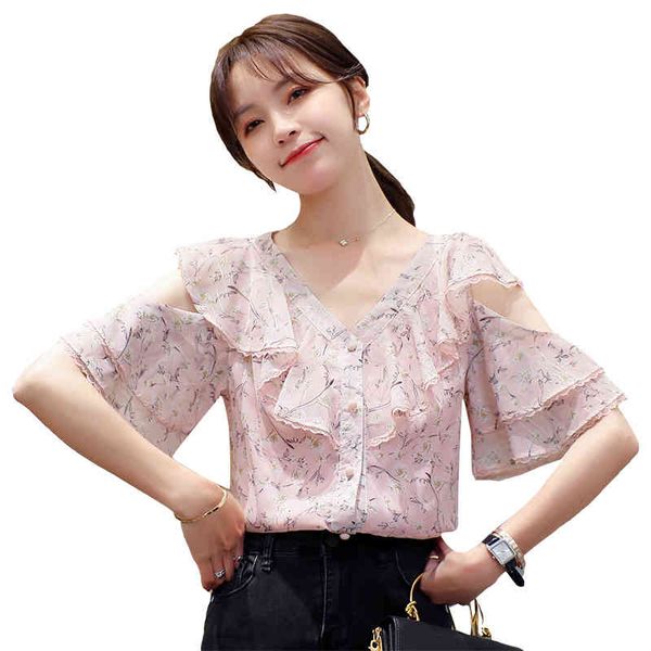 women's blouses & shirts women blouse printed blusas mujer de moda summer flower floral chiffon short sleeve ruffle woman clothes 232h, White