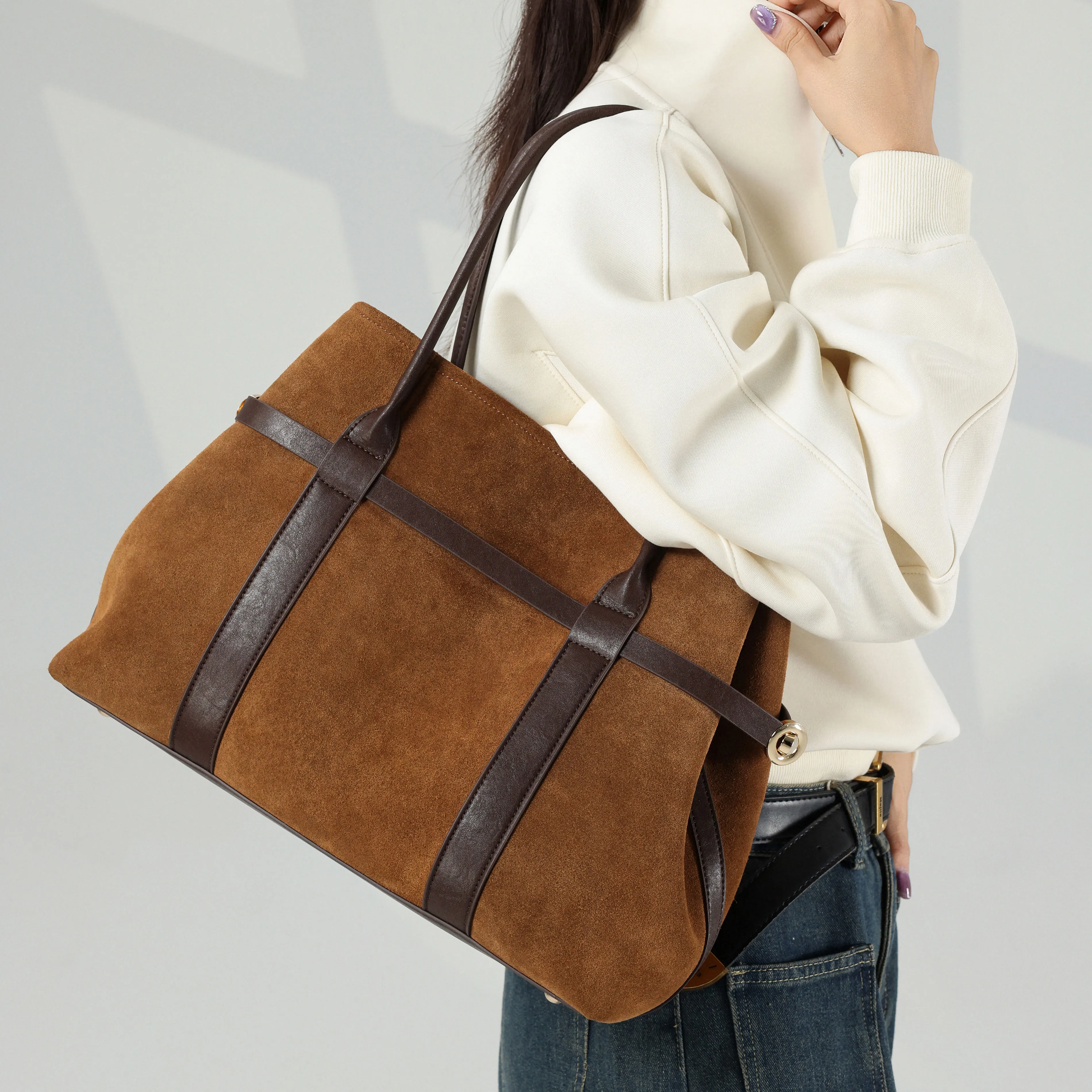 Замшевая сумка-тоут из воловьей кожи, большая вместительная женская повседневная сумка на плечо, новинка 2025 года, модная универсальная сумка