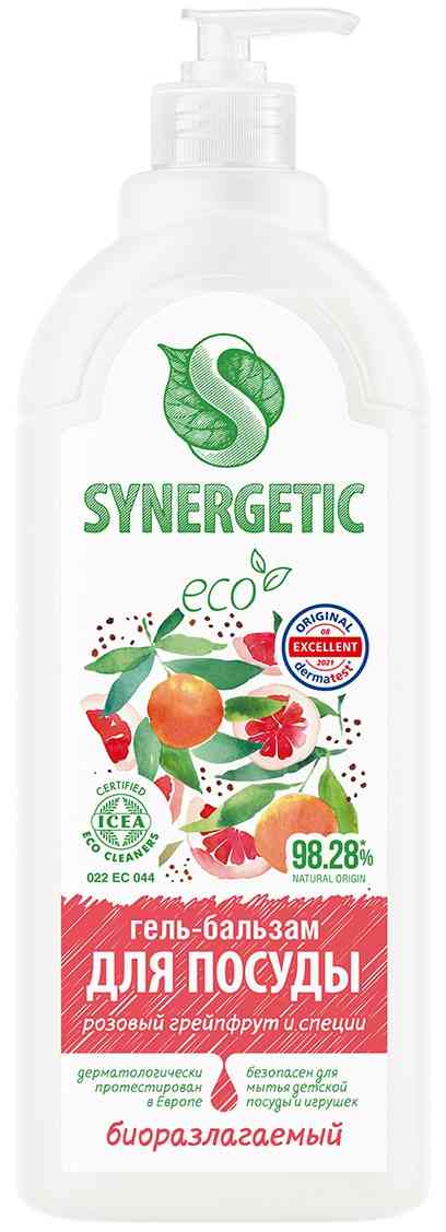 Биоразлагаемый гель-бальзам для посуды SYNERGETIC «Розовый грейпфрут и специи» предназначен для мытья всех видов посуды (в том числе детской), кухонного инвентаря и детских игрушек. Формула геля-бальзама - это баланс эффективного моющего средства и бережного отношения к коже при содержании 98,28 % натуральных компонентов. Комплекс ПАВ из растительного масла и энзимов эффективно удаляет жир и сложные загрязнения даже в холодной воде. Энзимы обеспечивают гигиеническую чистоту и блеск, защищают посуду от царапин, расщепляют загрязнения и устраняют неприятные запахи. В геле-бальзаме содержатся ухаживающие компоненты для увлажнения и защиты кожи рук. Экстракт ламинарии и спирулины питают кожу, делая ее более мягкой и повышая эластичность. Биолипиды и софоролипид обеспечивают увлажнение кожи рук, сохраняя естественный микробиом кожи и поддерживая ее защитные и регенерирующие функции. Гипоаллергенный гель-бальзам не содержит красителей, полностью смывается водой. Подходит для чувствительной кожи, дерматологически протестирован институтом Dermatest® в Германии. Биоразлагаемые компоненты не вредят микрофлоре септических установок и водным организмам.