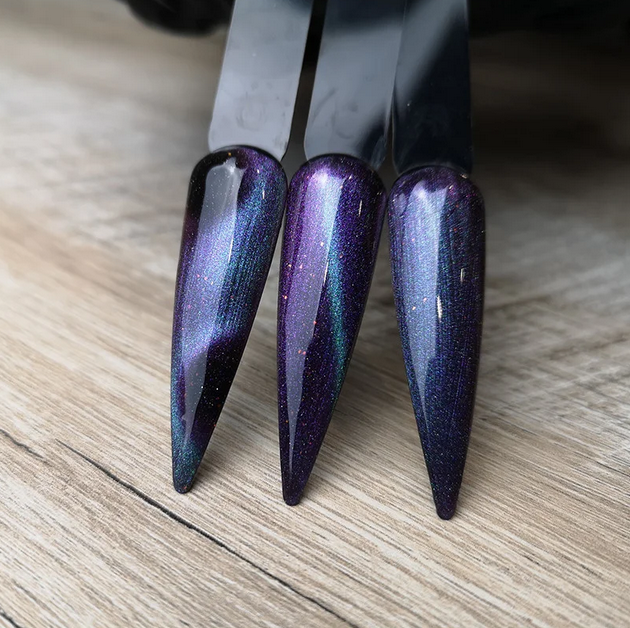 На типсах продемонстрирован гель лак кошачий глаз 12д №3 от фирмы Sweet Nails, который нанесен на черный фон. Гель лак невероятно красивый за счет своих переливов, которые меняются при разном освещении и под разным углом от синего к фиолетовому оттенку, видео обзор можно посмотреть на нашем канале.