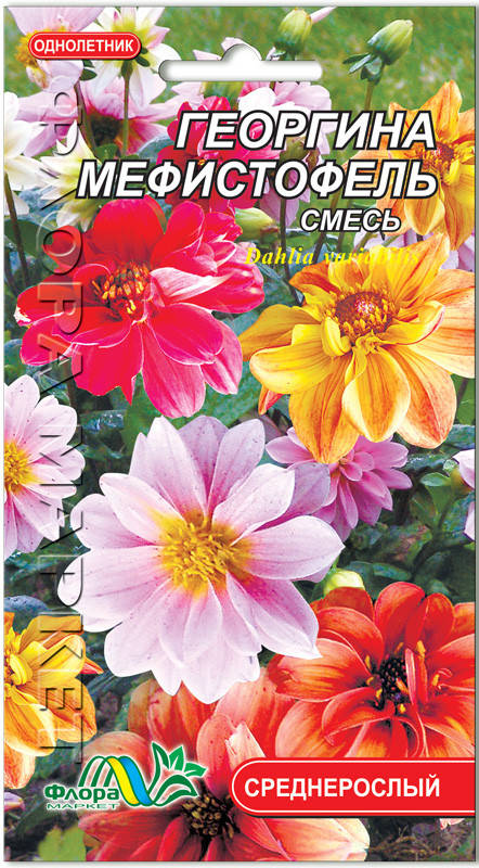 Однолетнее компактное растение высотой до 50 см. "Мефистофель" - очень эффектный сорт георгин с махровыми и полумахровыми цветами диаметром до 9 см. Окраска цветков бывает всех оттенков оранжевого, сиреневого, лавандового, алого, белого, желтого и малинового. Красочные цветы хорошо контрастируют с его темной листвой интересного бронзово-коричневого оттенка. Обильно цветет в течение всего лета . Легко выращивается из семян и используется в цветниках большими группами, для бордюров и рабаток. Прекрасно растет как горшечная культура и долго стоит "на срез".