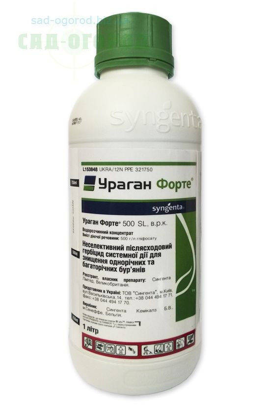 Список (неполный) уничтожаемых сорняков: Ураган Форте 500 SL в.р.к. действует против широкого спектра однолетних, многолетних злаковых и широколиственных сорняков, таких как: пырей, свинорий, гумай, осоты, березка, щирица, просовидные, мышей, камыш, лебеда, одуванчик, щавель.
