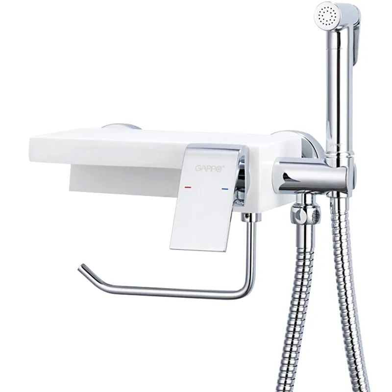 Смеситель для гигиенического душа Gappo G7296 интересное решение для интерьера, площадка позволяет разместить сверху мыльницу, а снизу рулон туалетной бумаги. Монтируется в стену, что позволяет разместить его наиболее компактно и секономить пространство.