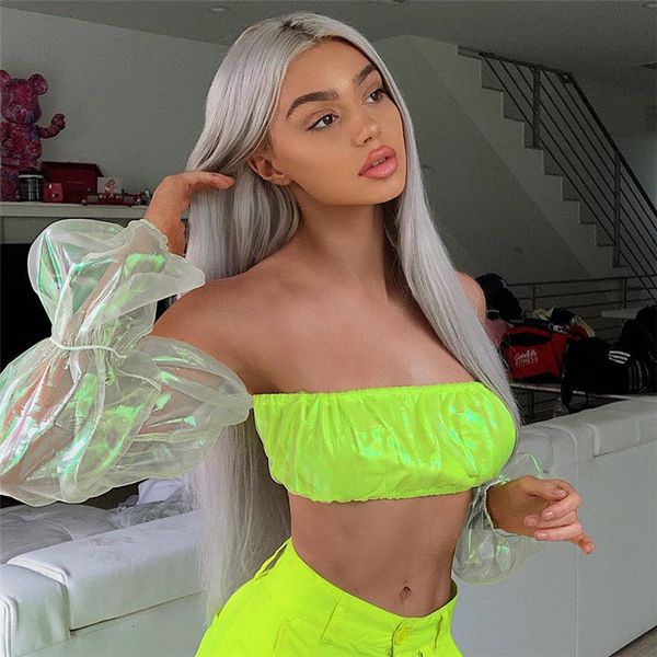 wear women's 2019 one word collar gauze bubble sleeve jacket shirt t shirts, Gray;blue