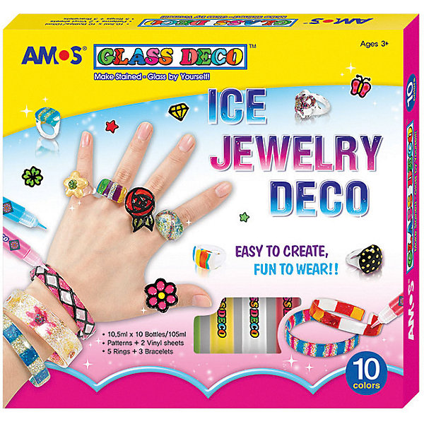Набор Amos «Ювелирные украшения» состоит из заготовок бижутерии, которые можно украсить цветными витражами из красок. Краски наносятся на пластину по трафарету и засыхают на воздухе. Рисунок можно отделить от пластины и приклеить к браслету или кольцу.