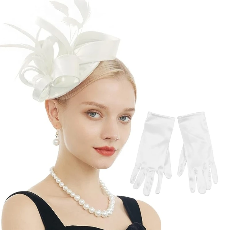Головной убор с перьями и цветами для женщин, головной убор, шляпа-чародер, повязка на голову + перчатки, 57BD
