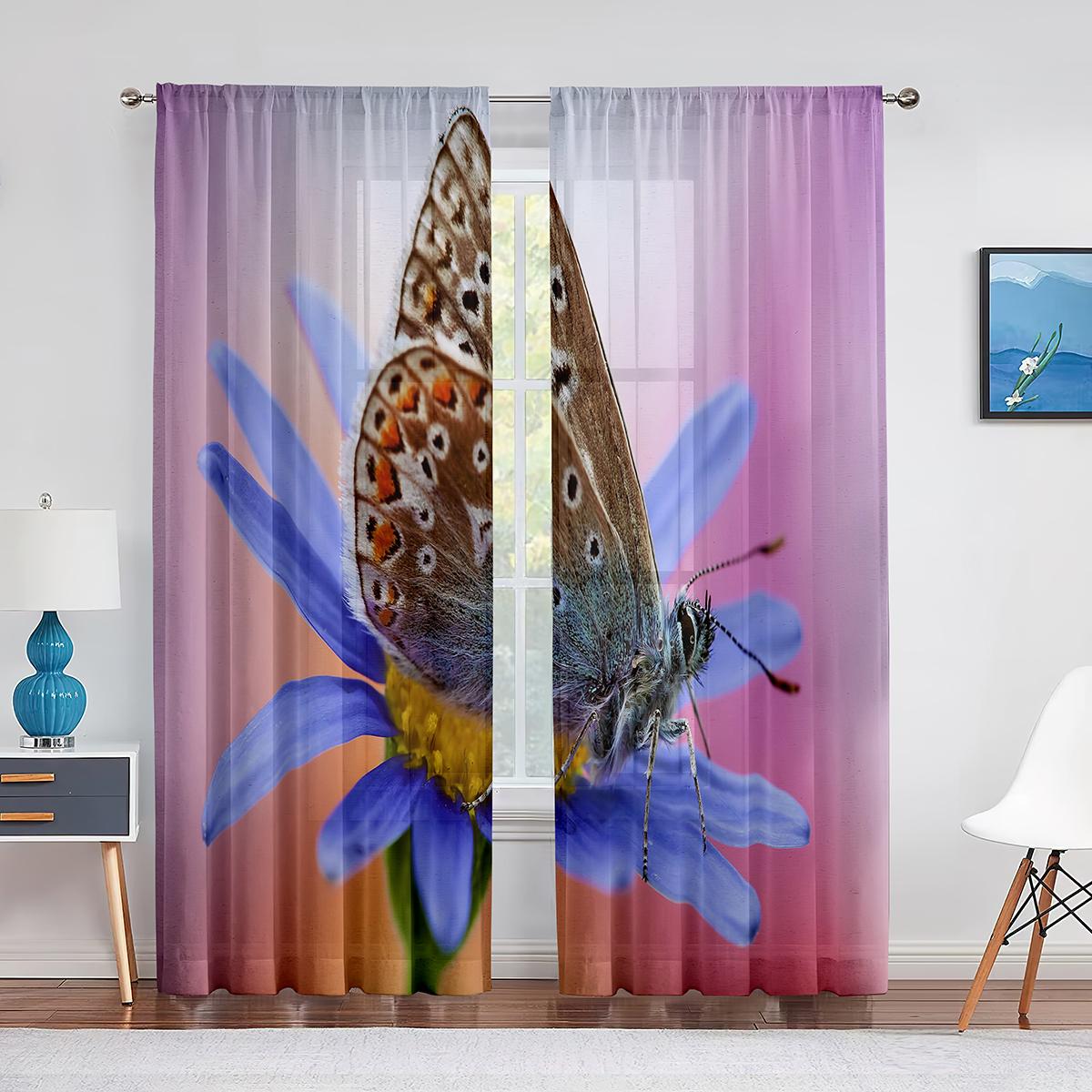 Голубая бабочка, фиолетовые цветочные мечтательные тюлевые шторы для гостиной, прозрачная вуаль, занавеска для спальни, декор для кухонных окон 1 PCS W100XH250cm&Grommet Top