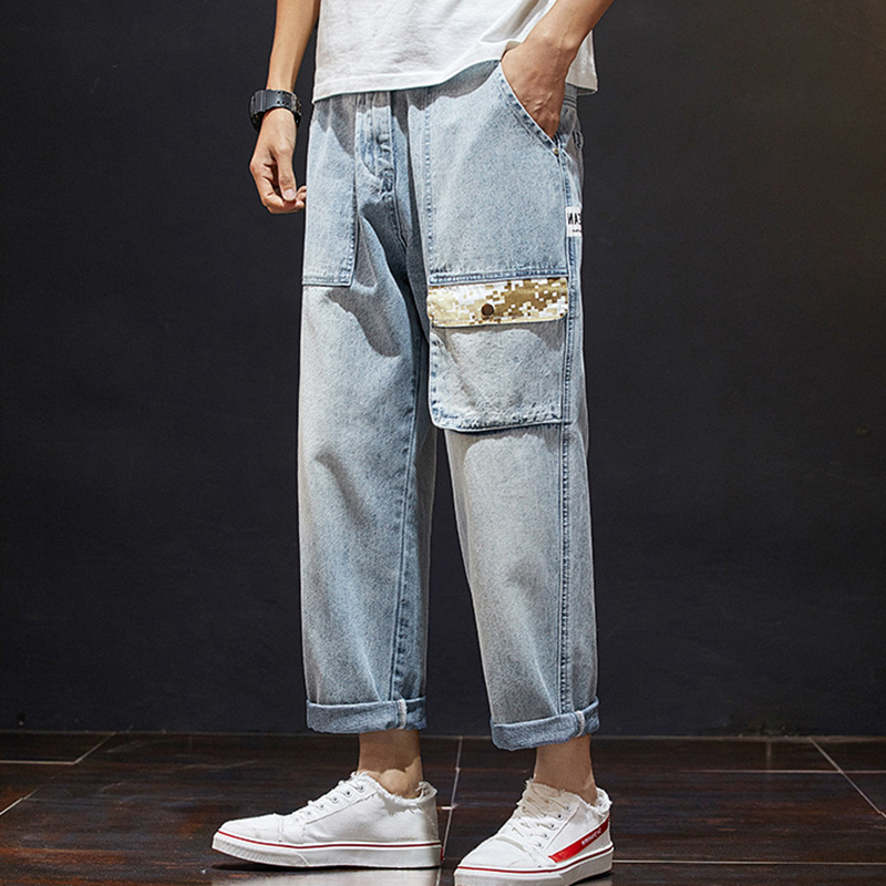 Men Loose Trendy Pocket Jeans Pants Straight Pants Trendy 9-point Fat Large Ankle-length Wide-leg Jeans, Xx8802
