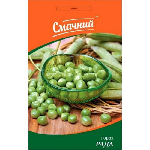 Среднеспелый сорт гороха универсального использования, готов к сбору через 67 дней после появления всходов. Стебель мощный, высотой 50-60см, устойчив к полеганию и не нуждается в опоре. Стручки большие, ровные, длиной 9-10 см, зерен 10-12 штук. Горошины цилиндрической формы, сладкие, созревают дружно. Содержание сухих веществ - 20.35%, общего сахара - 7.2%, витамину С - 31.2 мг/100 г, белка - 28.1%. «Рада» устойчив к весенним заморозкам и большинству заболеваний гороха. Используется для консервации, заморозки и употребления в свежем виде.