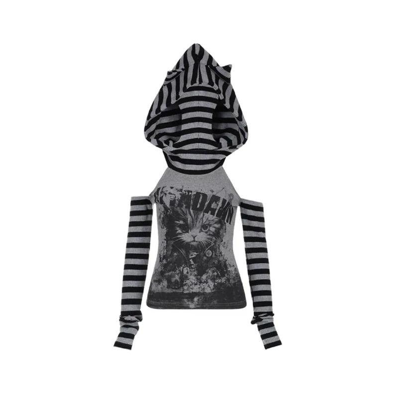 Готическая полосатая лоскутная толстовка с капюшоном для женщин в японском стиле, винтажный панк-принт с кошкой, тонкие пуловеры, мягкие, для девочек, 2000-е годы XL серый