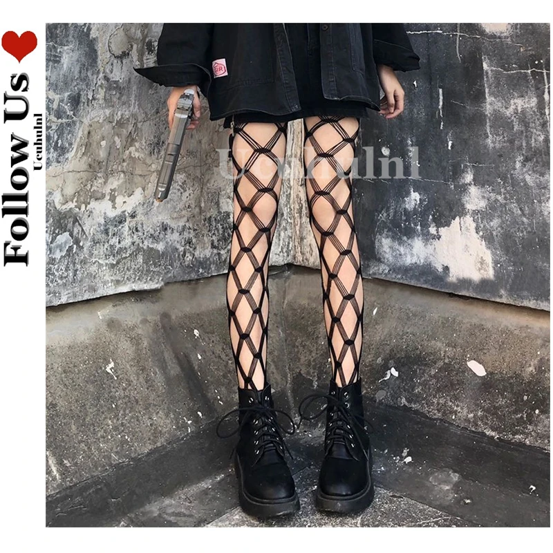 Готические чулки до колена, женские японские большие сетчатые ажурные чулки, колготки, сексуальные женские колготки с перекрестными завязк...