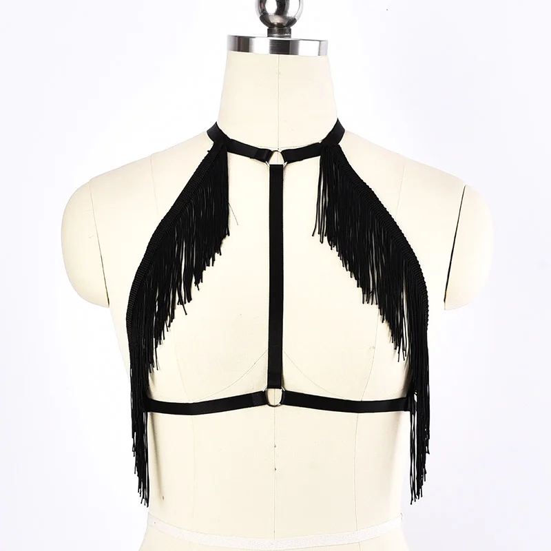 Готический черный бюстгальтер с кисточками ремень-подвязка пояс Женский клетка бондаж бюстгальтер подвязки с кисточками поясные ремни рейв костюм
