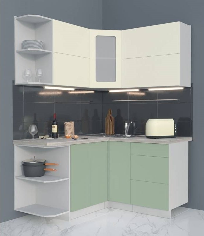 Готовая кухня Интерлиния Мила Матте 1.5x1.4 А правая (слон кость-мята-травертин серый)